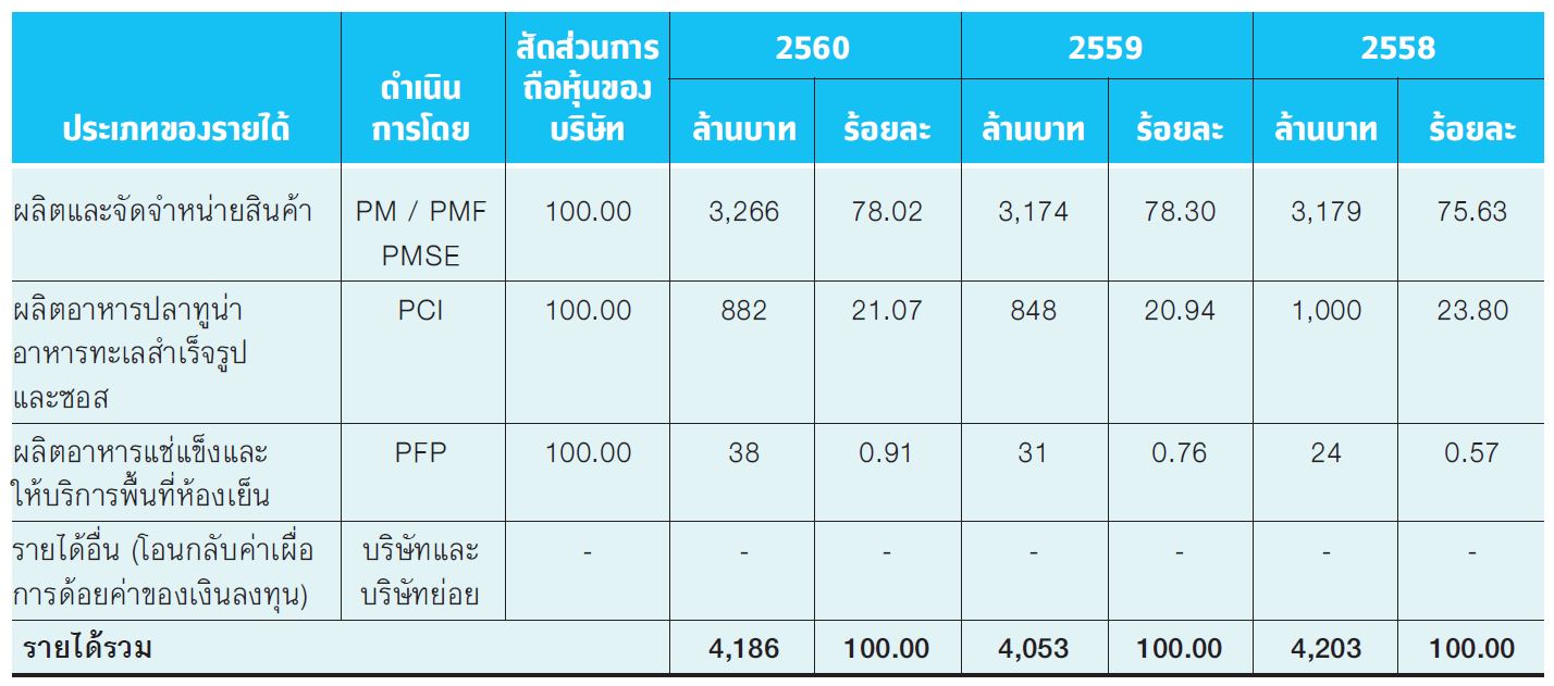 ตัวขับเคลื่อนรายได้ของ PM ในปี 2560 คือการมีสินค้าใหม่ในส่วนของปลาทูน่าและอาหารกระป๋อง รวมทั้งซอสที่มียอดขายมากขึ้น ส่วนธุรกิจผลิตและจัดจำหน่ายที่รายได้เพิ่มขึ้นเล็กน้อยก็เกิดจากการใช้บริการของลูกค้าเก่าและลูกค้าใหม่ อย่างเช่น มีการออกทาโร่รสชาติใหม่ๆ มากขึ้น รวมทั้งยังเป็นผู้จัดจำหน่ายให้กับสินค้าของบริษัทอื่นมากขึ้นอีกด้วย