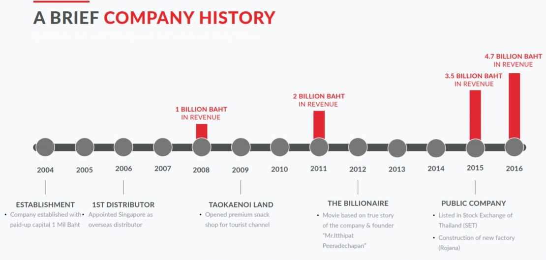 สาหร่ายเถ้าแก่น้อย ถือเป็นบริษัทในตลาดหลักทรัพย์แห่งประเทศไทย ที่มีการเติบโตในแง่ของรายได้มาโดยตลอด บริษัทก่อตั้งในปี 2004 ในโรงงานเล็กๆ ไม่กี่ ตรม. มาถึงวันนี้ TKN มีมูลค่าตามราคาตลาดเกิน 20,000 ล้านบาท และสร้างรายได้หลักพันล้านบาท ถือว่าเป็นการเติบโตที่น่าประทับใจมาก ในระยะเวลาเพียง 10 ปีกว่า