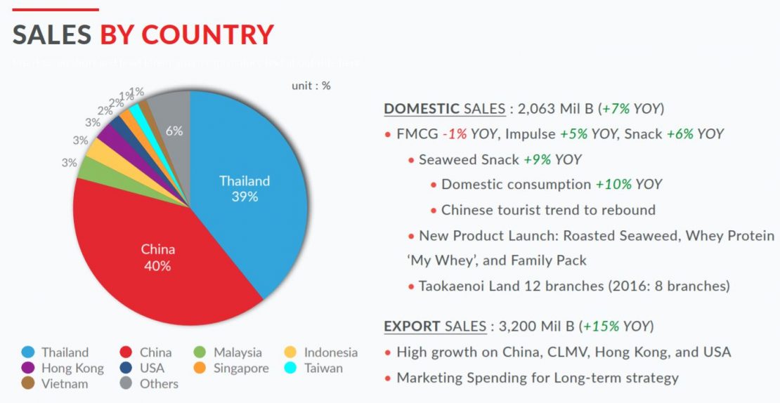 จุดเด่นของ TKN นั้นคือการเติบโตในต่างประเทศ และประเทศที่ TKN มีการส่งออกไปเยอะมาก (มากกว่าขายในไทยอีก) คือประเทศจีน ที่สร้างรายได้ให้กับ TKN มาเป็นกอบเป็นกำตลอด 3 ปีที่ผ่านมา