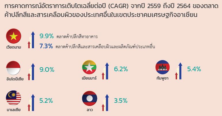 4) TOA มีส่วนแบ่งตลาดในตลาดสี AEC อยู่ 13% และในเวียดนาม 10% ซึ่ง TOA มีแผนมากมายที่จะไปลงทุนฐานกำลังการผลิตในประเทศ CLMV (กัมพูชา ลาว พม่า เวียดนาม) ซึ่งในตลาดเหล่านี้มีกำลังในการเติบโต
