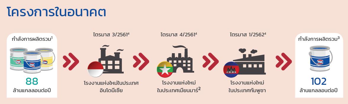 5) ปัจจุบัน TOA มีกำลังการผลิตสีทั้งหมด 88 ล้านแกลลอนต่อปี และภายในปี 2562 จะมีกำลังการผลิตทั้งหมด 102 ล้านแกลลอนต่อปี โดยในปี 2560 มีอัตราการใช้กำลังการผลิตที่ 51% หรือเพียงครึ่งเดียวเท่านั้น