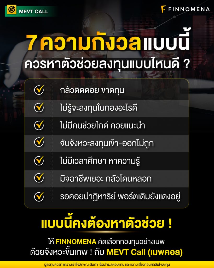ความกังวลในการลงทุนเป็นสิ่งที่ดี เพราะมันคือเครื่องยืนยันว่าเรากำลังก้าวเข้ามาในโลกของการลงทุน เพื่อทำให้ตัวเองมีอิสรภาพทางการเงิน แต่หลาย ๆ ครั้งความกังวลเหล่านั้นอาจฉุดรั้งคุณจากโอกาสการลงทุนครั้งใหม่ ถึงเวลาที่ต้องมีตัวช่วยแล้ว ! ลองมาให้ FINNOMENA คัดเลือกกองทุนอย่างเมพ ด้วยจังหวะขั้นเทพ กับ MEVT Call (เมพคอล) กันเถอะ !