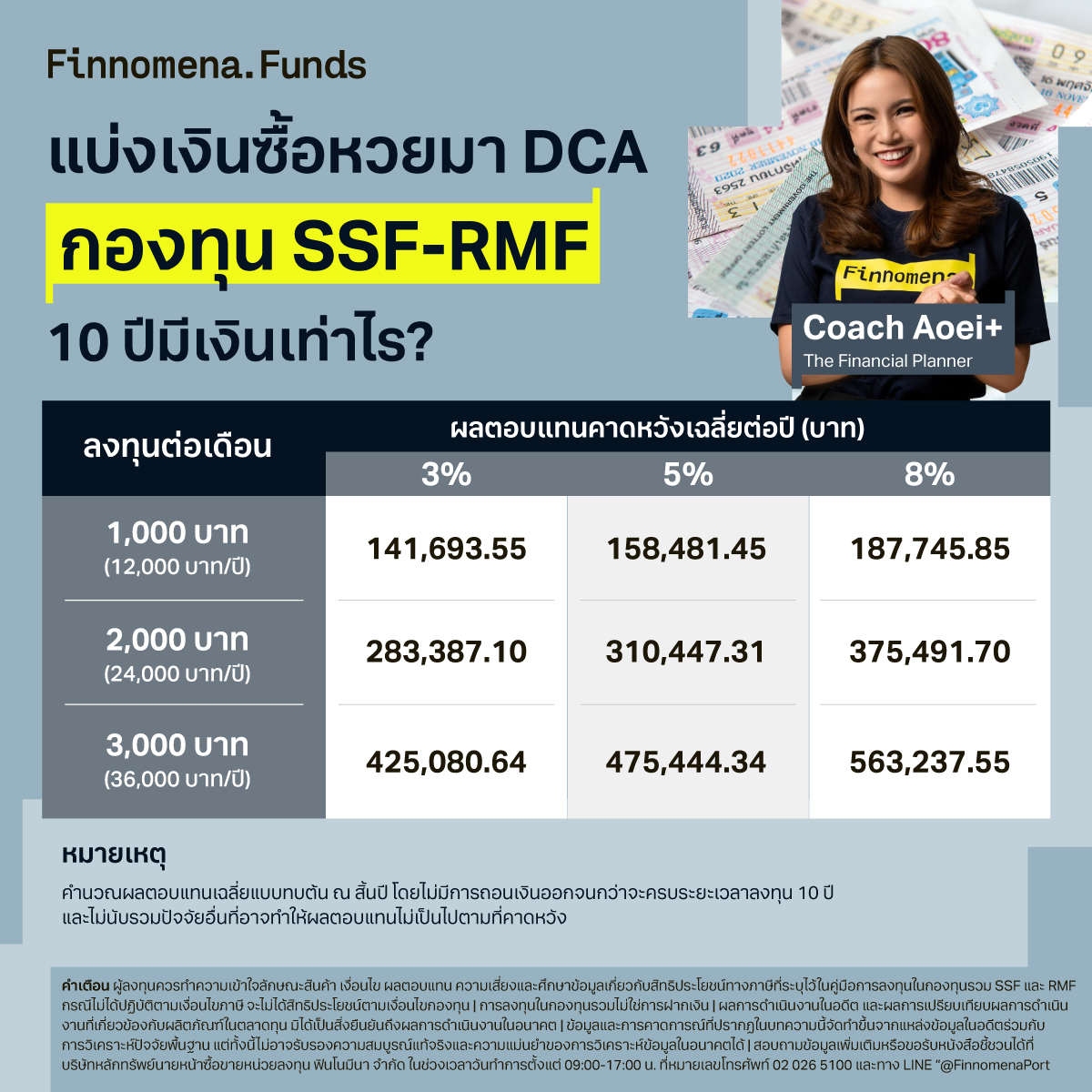 อย่างไรก็ตาม การซื้อหวยสามารถทำได้ เพราะนอกจากจะเป็นการสร้างสีสันให้ได้ลุ้นพลิกชีวิตเป็นเศรษฐีหน้าใหม่เดือนละ 2 ครั้งแล้ว ยังเป็นการสร้างรายได้ให้รัฐบาลเพื่อใช้ในการขับเคลื่อนเศรษฐกิจต่อไปด้วย แต่อย่าลืม! แบ่งเงินมาลงทุนในแต่ละเดือนด้วยการลงทุนแบบ DCA ในกองทุน SSF-RMF ให้เงินงอกเงย แถมได้นำไปลดหย่อนภาษีกันด้วยนะ