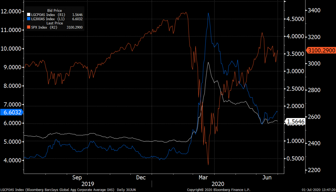 ภาพแสดง Credit Spread ของตราสารหนี้เอกชนเกรดลงทุน (เส้นสีขาว) กับตราสารหนี้เกรดตำ่ (เส้นสีนำ้เงิน)