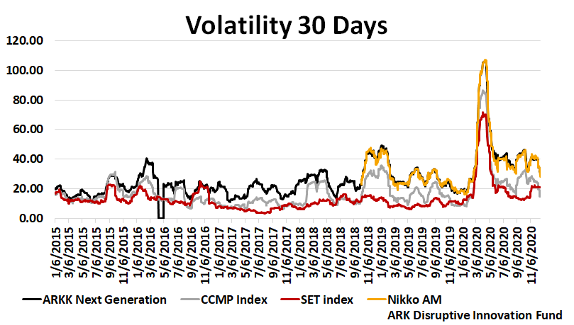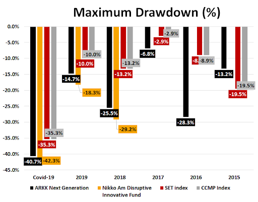 แม้ว่าผลตอบแทนย้อนหลังของกองทุนที่บริหารโดย Arkk Investment Management จะดูโดดเด่นเมื่อเปรียบเทียบกับดัชนี SET Index และ Nasdaq แต่ในแง่ของความเสี่ยงกองทุนทั้ง 2 กองมีความผันผวนค่อนข้างมากและมีโอกาศปรับตัวลงจากจุดสูงสุดได้มากกว่า SET Index และ Nasdaq ดังนั้นกองทุนของ Arkk ETF เหมาะกับนักลงทุนที่รับความเสี่ยงได้ค่อนข้างมาก