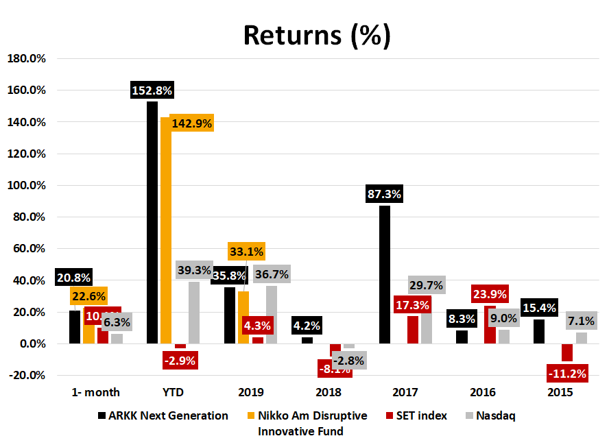 Arkk Disruptive Innovation Fund เป็นอีกหนึ่งกองทุนที่ทำผลตอบแทนได้อย่างโดดเด่นในปีนี้ ในประเทศไทย มี 2 กองทุนรวมที่ได้นำ Arkk Disruptive Innovation Fund มาให้คนไทยได้ลงทุน ซึ่งนั่นก็คือ TMB-ES-GINNO และ TNEXTGEN