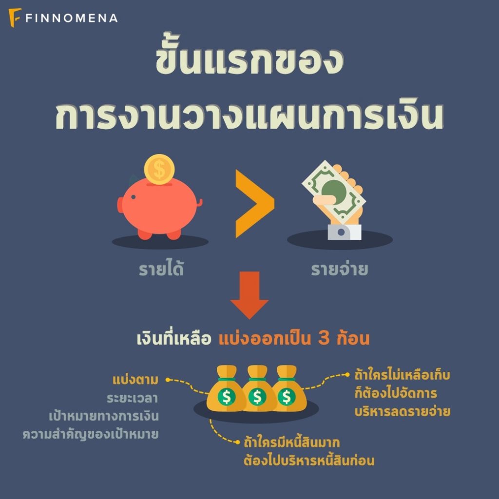เริ่มต้น! ขั้นแรกของการงานวางแผนการเงินคือ “รายรับต้องมากกว่ารายจ่าย” เมื่อเราได้เงินเดือนในแต่ละเดือนมาแล้ว ให้ลบค่าใช้จ่ายที่จำเป็นต้องใช้ออกไปก่อน เช่น ค่าที่พัก ค่ากินอยู่ ค่าเดินทาง ค่าชอปปิ้ง ไลฟ์สไตล์ และอื่น ๆ