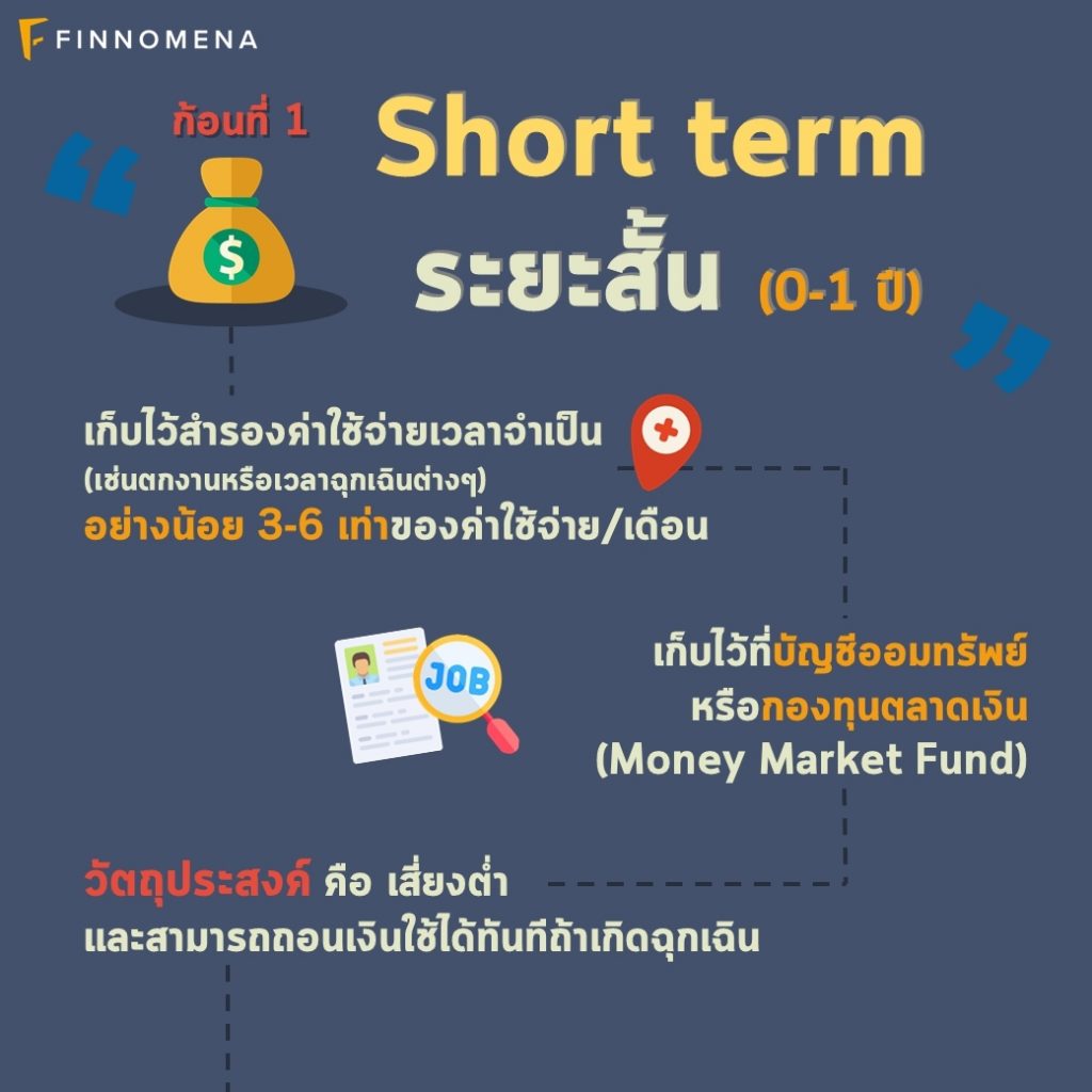 วัตถุประสงค์ คือ เสี่ยงต่ำ และสามารถถอนเงินใช้ได้ทันทีถ้าเกิดฉุกเฉิน ถ้าเริ่มเก็บให้ได้สัก 3 เดือนของรายจ่ายจำเป็น เราจะเริ่มมีความอุ่นใจทางการเงินระดับแรกแล้วนะครับ ใครถึงแล้วผมขอแสดงความยินดีด้วยนะครับ