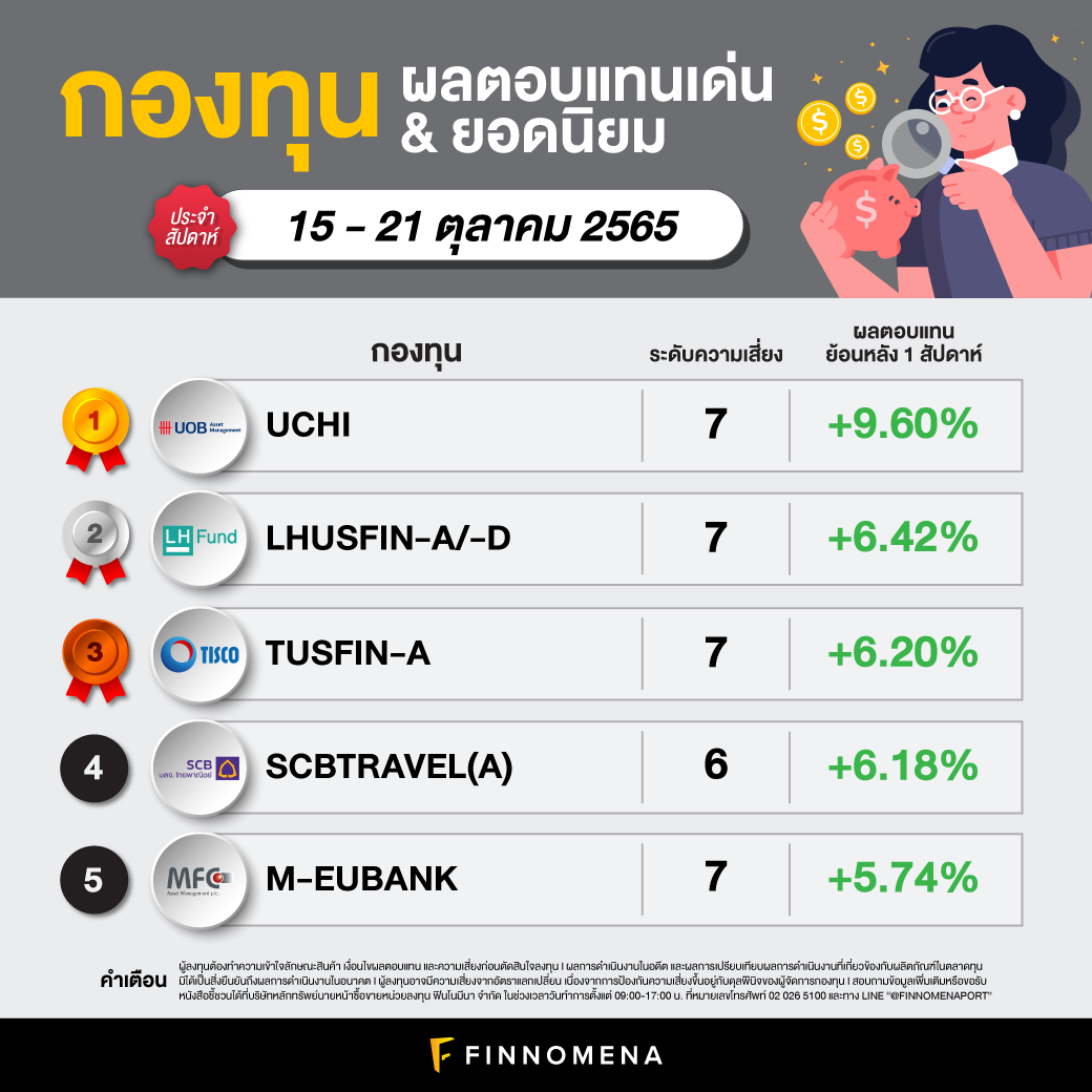 ในช่วงสัปดาห์ที่ผ่านมา วันที่ 15 – 21 ต.ค. 2565 มีกองทุนไหนทำผลตอบแทนได้โดดเด่น และเป็นกองทุนยอดนิยมที่มีผู้ค้นหามากที่สุดบนเว็บไซต์และแอปพลิเคชัน FINNOMENA บทความนี้จะขอพาผู้อ่านไปดูกันครับ5 อันดับ กองทุนผลตอบแทนดีประจำสัปดาห์ (15 – 21 ต.ค. 65)