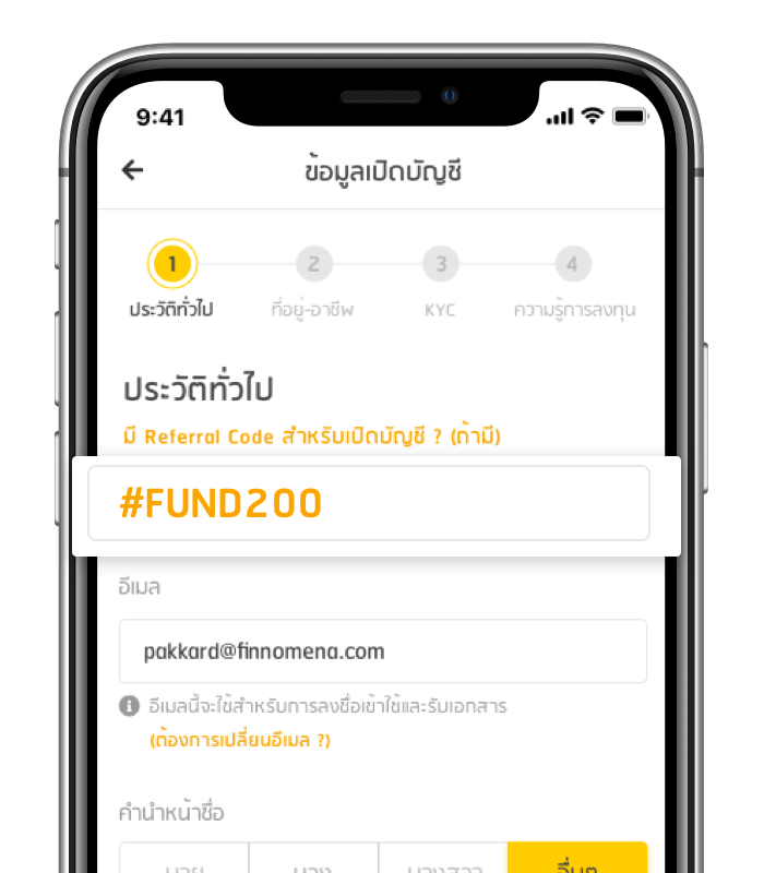 - ผู้รับสิทธิ์จะต้องใส่รหัส #FUND200 ในช่อง Referral Code ในขั้นตอนการเปิดบัญชีเพื่อให้ครบเงื่อนไขในการรับของรางวัลตามโปรโมชั่น (หากคุณมีผู้แนะนำการลงทุนดูแลอยู่ ใส่รหัสผู้ดูแล ตามด้วย #FUND200 ไม่ต้องเว้นวรรค)