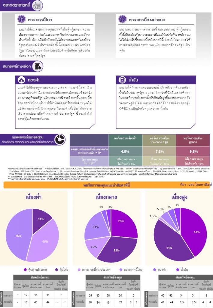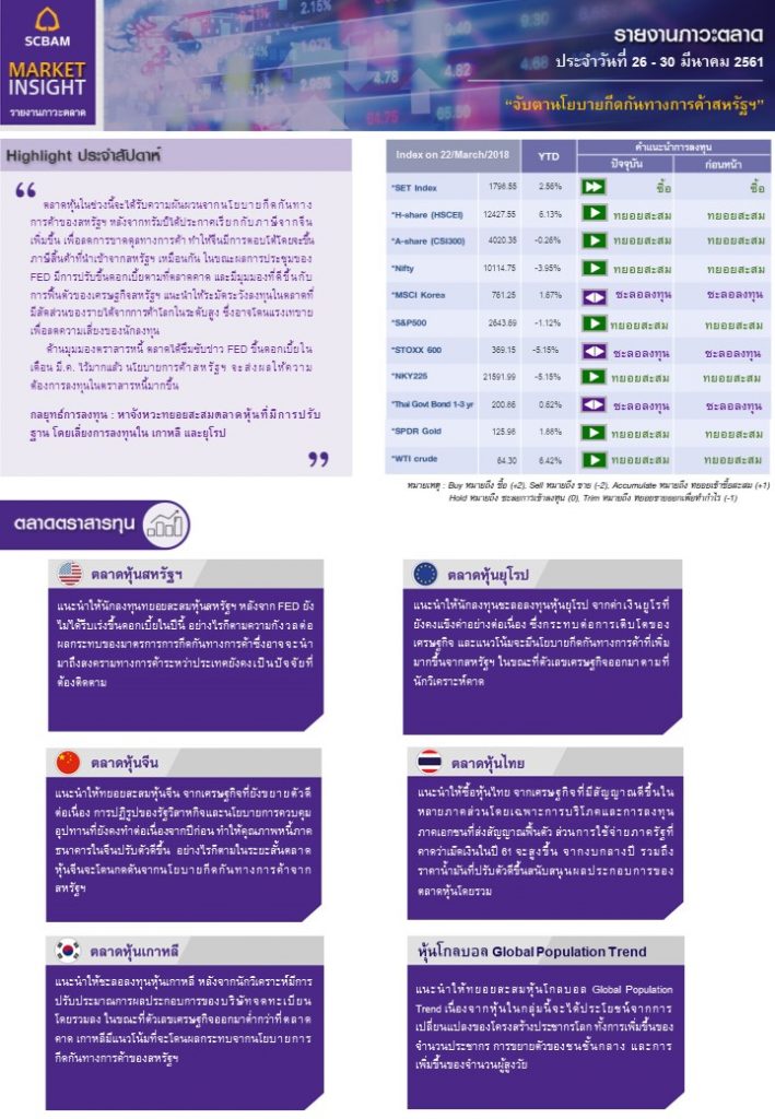 ตลาดหุ้นในช่วงนี้จะได้รับความผันผวนจากนโยบายกีดกันทางการค้าของสหรัฐฯ หลังจากทรัมป์ได้ประกาศเรียกกับภาษีจากจีนเพิ่มขึ้น เพื่อลดการขาดดุลทางการค้า ทำให้จีนมีการตอบโต้โดยจะขึ้นภาษีสิ้นค้าที่นำเข้าจากสหรัฐฯ เหมือนกัน ในขณะผลการประชุมของ FED มีการปรับขึ้นดอกเบี้ยตามที่ตลาดคาด และมีมุมมองที่ดีขึ้นกับการฟื้นตัวของเศรษฐกิจสหรัฐฯ แนะนำให้ระมัดระวังลงทุนในตลาดที่มีสัดส่วนของรายได้จากการค้าโลกในระดับสูง ซึ่งอาจโดนแรงเทขายเพื่อลดความเสี่ยงของนักลงทุน