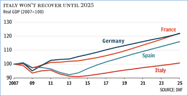 เป็นที่น่าผิดหวังกับการประกาศตัวเลข GDP ไตรมาส 2/2016 ที่หลายฝ่ายคาดว่าเศรษฐกิจอิตาลีน่าจะโตที่ 0.2% แต่ผลที่ออกมากลับเป็นตัวเลข 0% !! ซึ่งหากย้อนไปดูข้อมูลของ IMF ก็จะเห็นชัดว่า อิตาลีมีความเปราะบางมาก ถึงขั้นที่ IMF บอกว่า เศรษฐกิจอิตาลีจะไม่ฟื้นตัวจนกว่าจะถึงปี 2025 (อีกประมาณ 9 ปีข้างหน้า)
