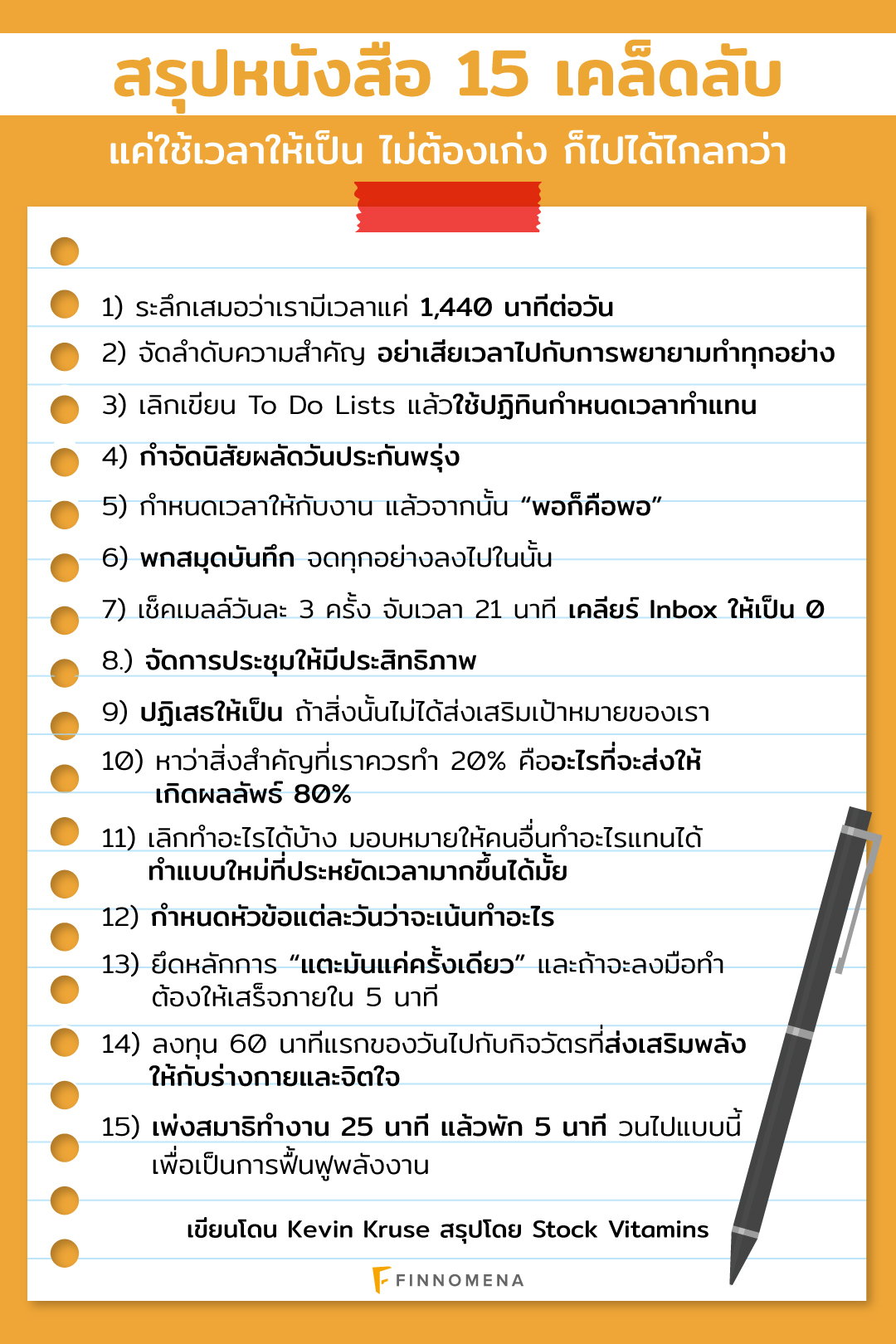 และนี่ก็คือ 15 เคล็ดลับดีๆ จากหนังสือเล่มนี้ครับ ยังไงลองเอาไปปรับใช้กันดู หลายข้อเลยที่ผมว่าดี แต่ก็อาจมีบางข้อที่อาจไม่เข้ากับบริบทของคนไทยหรือการเป็นลูกจ้างบริษัท ลองเลือกดูแล้วเอาไปใช้ให้เหมาะกับตัวเองกันนะครับ เพราะสุดท้ายถ้าเราบริหารเวลาได้ดี เราก็จะบริหารชีวิตเราได้ดีเช่นกัน