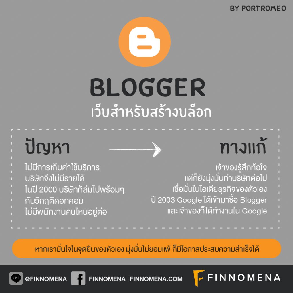 Blogger คือแพลตฟอร์มการเขียนบล็อกที่ดังระดับหนึ่งในอดีต แต่ด้วยความที่เป็นแพลตฟอร์มบล็อกแบบไม่มีการเก็บตังค์ ให้ใช้กันฟรีๆ บริษัทจึงไม่มีรายได้ ในปี 2000 บริษัทก็ล่มไปพร้อมๆ กับวิกฤติดอทคอม ทาง Evan Williams ผู้ก่อตั้งได้บอกกับพนักงานตามตรงว่าบริษัทกำลังจะเจ๊ง คงไม่มีเงินเดือนจ่ายให้แล้ว แน่นอนว่าไม่มีพนักงานคนไหนอยู่ต่อ