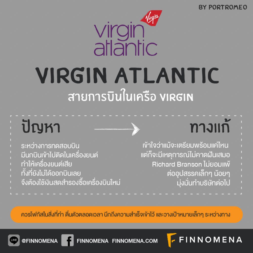 Richard Branson บอกว่าการเกิดขึ้นมาของ Virgin Atlantic ในปี 1984 ได้ส่งผลกระทบด้านการเงินต่อบริษัทอื่นๆ ในเครือ Virgin เขาตัดสินใจเช่าเครื่องบินลำแรกเพื่อลดความเสี่ยงเป็นเวลาหนึ่งปี แต่แล้ว ปัญหาก็เกิดขึ้นระหว่างการทดสอบบิน เมื่อมีนกบินเข้าไปติดในเครื่องยนต์ ทำให้เครื่องยนต์เสีย จึงต้องใช้เงินสดสำรองซื้อเครื่องบินใหม่ จากเหตุการณ์นี้ Branson ได้แสดงให้เห็นว่าแม้ว่าคุณจะเตรียมพร้อมแค่ไหน แต่ก็จะมีเหตุการณ์ไม่คาดฝันเกิดขึ้นได้เสมอ ดังนั้น เขาจึงแนะนำว่าเราควรโฟกัสในสิ่งที่ทำ ตื่นตัวตลอดเวลา นึกถึงความสำเร็จเข้าไว้ และวางเป้าหมายเล็กๆ ระหว่างทาง