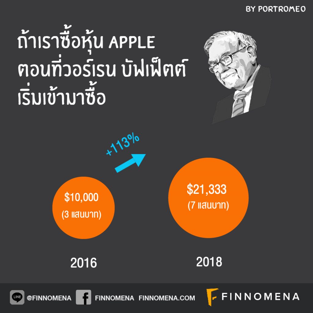 เป็นที่รู้กันว่าวอร์เรน บัฟเฟ็ตต์ นักลงทุนระดับโลกผู้นี้ไม่ใช่สายหุ้นเทคโนโลยี เขาไม่ได้ซื้อ Google และ Amazon (อันนำมาซึ่งความเสียดายในปัจจุบัน) แต่เมื่อมาถึงหุ้น Apple บัฟเฟ็ตต์ก็มองเห็นโอกาสอันดี โดยบริษัท Berkshire Hathaway ของเขาได้เปิดเผยว่าได้เข้าซื้อหุ้น Apple เป็นครั้งแรกในวันที่ 16 พฤษภาคม 2016 ตอนที่ราคาหุ้นอยู่ที่ประมาณ $92