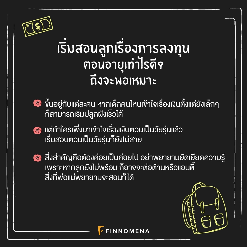 ใครที่สงสัยว่าควรเริ่มสอนลูกเรื่องการลงทุนตั้งแต่อายุเท่าไร ถึงจะเรียกว่าพอเหมาะพอดี เราว่าทั้งนี้ขึ้นอยู่กับแต่ละคน หากเด็กคนไหนเข้าใจเรื่องเงินตั้งแต่ยังเล็กๆ ก็สามารถเริ่มปลูกฝังเร็วได้ แต่ถ้าใครเพิ่งมาเข้าใจเรื่องเงินตอนเป็นวัยรุ่นแล้ว เริ่มสอนตอนเป็นวัยรุ่นก็ยังไม่สาย สำหรับเรานั้น ถ้าจำไม่ผิด ตอนอายุประมาณ 10 ต้นๆ ก็เริ่มที่จะได้รับความรู้เรื่องการลงทุนแล้ว สิ่งสำคัญคือต้องค่อยเป็นค่อยไป อย่าพยายามยัดเยียดความรู้ให้ลูก เพราะหากลูกยังไม่พร้อม ก็อาจจะต่อต้านหรืออาจถึงขั้นแอนตี้สิ่งที่พ่อแม่พยายามจะสอนเลยก็ได้