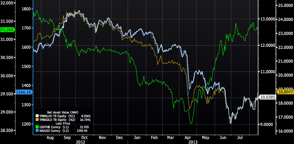 - กองทุนทองระดับโลกที่เราคุ้นเคยชื่อเสียงมากที่สุดคงหนีไม่พ้น SPDR Gold Trust ซึ่งเป็นกองทุน ETF ทองที่ใหญ่ที่สุดในโลก ปริมาณทองคำที่ SPDR Gold Trust ถืออยู่นั้นจะแตะ 800 ตันแล้ว ส่วนกองทุน TMBGOLDS ของ บลจ.ทหารไทย ลงทุนใน SPDR Gold Trust อีกที ด้วยการบริหารแบบ Passive ซึ่งก็จะมุ่งหวังให้ผลดำเนินงานเป็นไปตาม SPDR Gold Trust