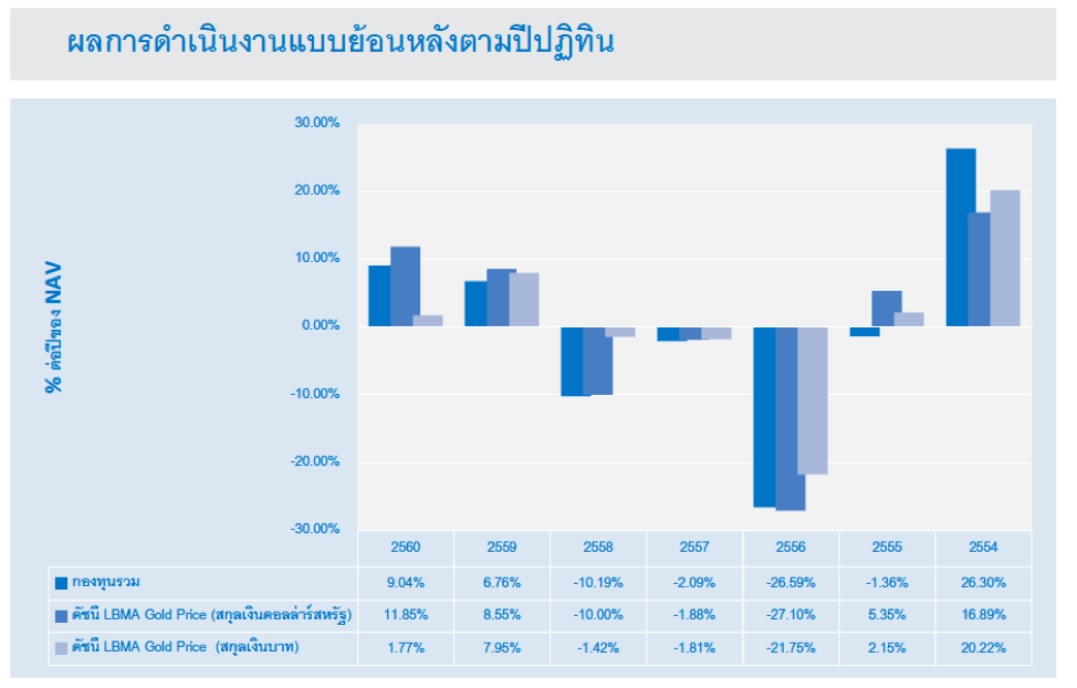 ผลการดำเนินงานย้อนหลังตั้งแต่ปี 2011 ซึ่งเป็นปีที่กองทุนเข้าจดทะเบียน ดูแล้วค่อนข้างผันผวนเลยทีเดียว แต่ถึงอย่างนั้นก็สอดคล้องกับราคาทองของโลก โดยผลตอบแทนที่สูงสุดคือ 26.3% ในปี 2011 ซึ่งเป็นปีที่กองทุนจัดตั้ง ส่วนปีที่หนักหน่วงสุดคือ 2013 ซึ่งติดลบไปกว่า 26.59%