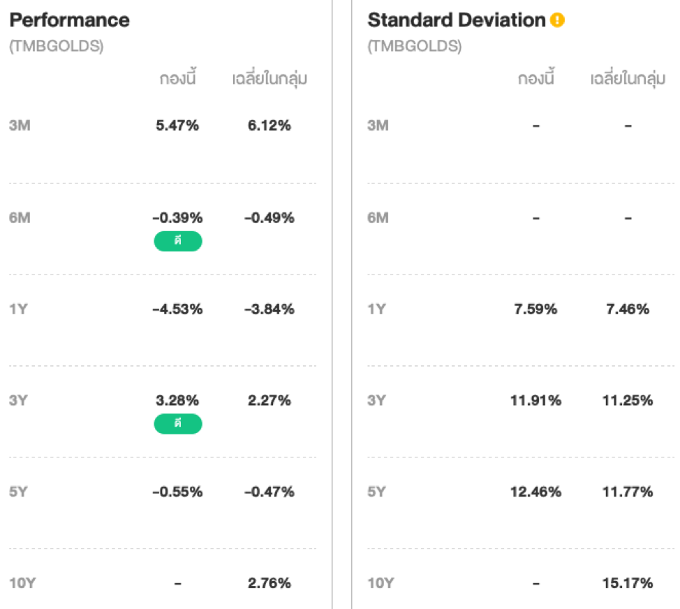 และเมื่อเทียบผลตอบแทนย้อนหลังกับผลตอบแทนเฉลี่ยในกลุ่มกองทุนทองคำด้วยกัน ก็ถือว่าค่อนข้างสูสีกันเลย ไม่ว่าจะในแง่ของผลตอบแทน หรือ ความเสี่ยง ตามรูปด้านล่างที่เราแคปมาจาก https://www.finnomena.com/fund/tmbgolds/
