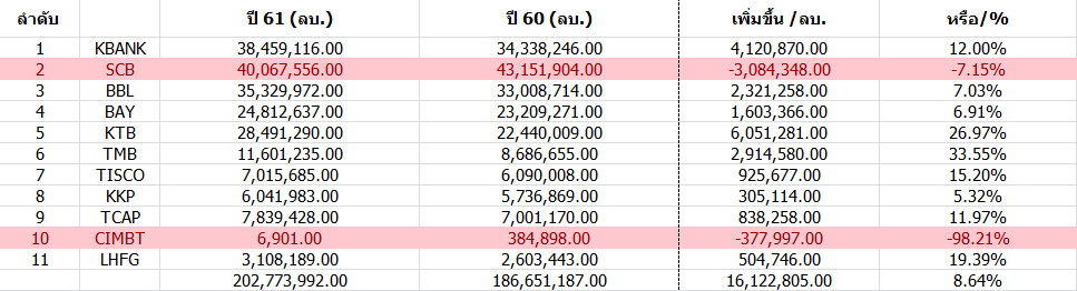 โดยพบว่ามีกำไรสุทธิ ปี 61 รวม 209,086 ล้านบาท เพิ่มขึ้น 15,917 ล้านบาท เมื่อเทียบกับช่วงเดียวกันของปี 60 อยู่ที่ 193,169 ล้านบาท