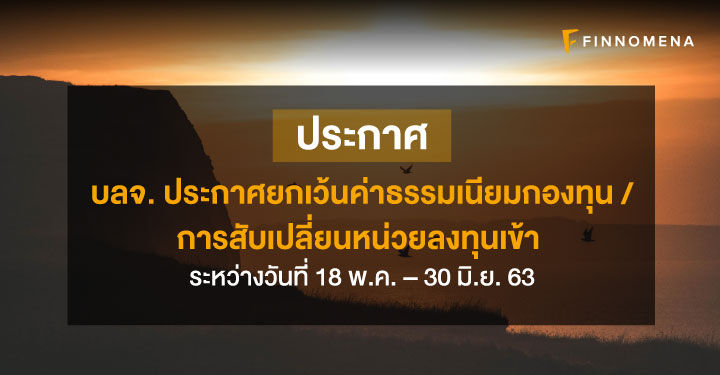 บลจ. ประกาศยกเว้นค่าธรรมเนียมกองทุน / ค่าธรรมเนียมการสับเปลี่ยนหน่วยลงทุนเข้า ระหว่างวันที่ 18 พ.ค. – 30 มิ.ย. 63 เพื่อช่วยแบ่งเบาภาระผู้ลงทุนเป็นการชั่วคราวในช่วงสภาพเศรษฐกิจการเงินขณะนี้ โดยรายละเอียดดังต่อไปนี้