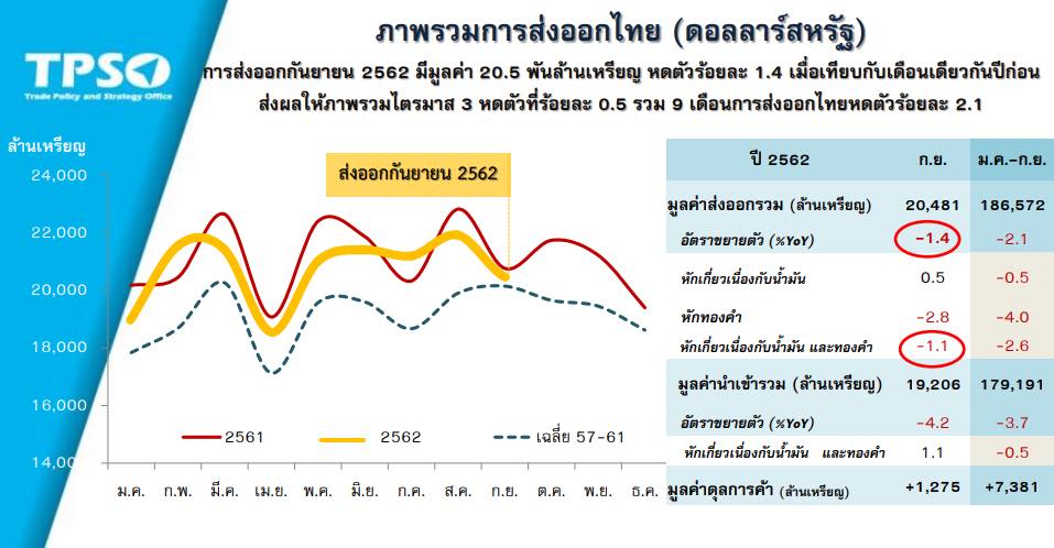 - การส่งออกไทยในเดือนกันยายน 2562 มีมูลค่า 20,481 ล้านเหรียญสหรัฐ หดตัว 1.4% เมื่อเทียบกับเดือนเดียวกันของปีก่อน ขณะที่การนำเข้ามีมูลค่า 19,206 ล้านเหรียญสหรัฐ หดตัว 4.2% ส่งผลให้การค้าไทยเกินดุล 1,275 ล้านเหรียญสหรัฐ