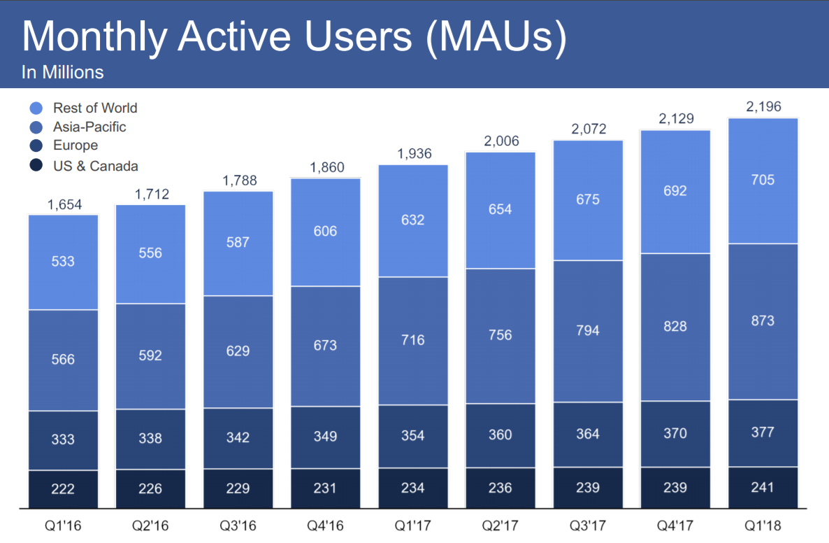 - ด้านตัวเลขผู้ใช้แบบรายวัน (Active User) อยู่ที่ 1,449 ล้านราย เพิ่มขึ้นจากไตรมาสสุดท้ายและไตรมาสแรกของปี 2017 ที่ 48 ล้านราย และ 165 ล้านรายตามลำดับ ส่วนยอดผู้ใช้แบบรายเดือน (Active User) ของไตรมาส 1 ปี 2018 พบว่ามีสูงถึง 2,196 ล้านราย เติบโตขึ้น 13% จากช่วงเวลาเดียวกันของปีที่แล้ว