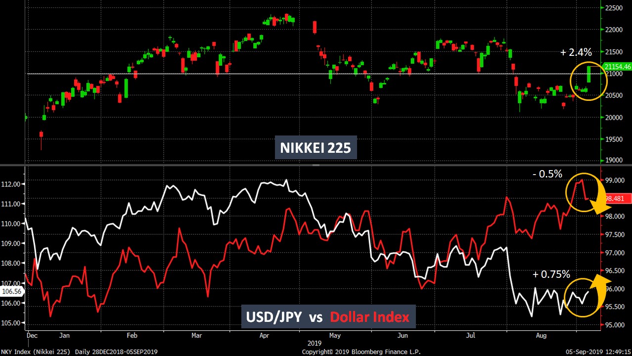 โดยตลาดหุ้นญี่ปุ่นได้รับปัจจัยเสริม จากการอ่อนค่าของสกุลเวนในประเทศ หลังจากที่ดอลลาร์สหรัฐปรับตัวอ่อนค่าเมื่อเทียบกับสกุลเงินทั่วโลก โดย Dollar index อ่อนค่าถึง 0.50% ขณะที่เงินเยนญี่ปุ่น เองก็ปรับตัวอ่อนค่ามากกว่า โดยอ่อนค่าถึง 0.75% เทียบดอลลาร์สหรัฐ และอ่อนค่าเทียบสกุลเงินทั่วโลกราว 0.52% ซึ่งจะส่งผลดีต่อการภาคส่งออก
