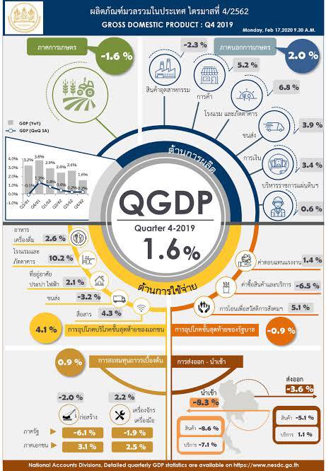 ตัวเลข GDP ล่าสุดของไทยในไตรมาสที่ 4 ของปี 62 เทียบกับปี 61 อยู่ที่ 1.6% ตํ่ากว่าการคาดการณ์ที่ 2.1% ซึ่งถือว่าต่ำสุดใน 21 ไตรมาส