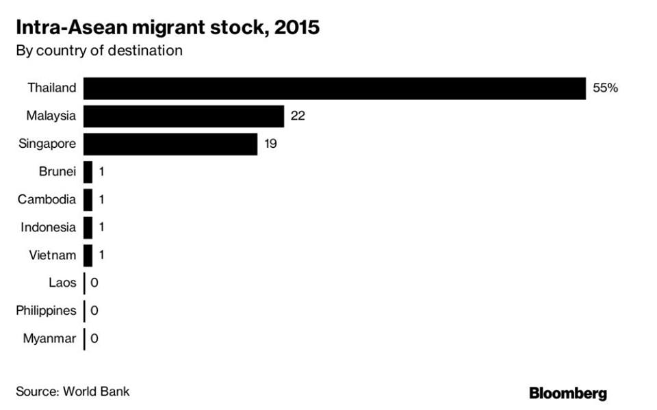 ข้อมูลจาก World Bank และ Bloomberg ระบุว่า ประเทศไทย มาเลเซีย และสิงคโปร์ จัดเป็นประเทศเป้าหมายของกลุ่มแรงผู้อพยพในอาเซียนมากที่สุดกว่าผู้อพยพราว 6.5 ล้านคน แบ่งเป็นประเทศเป้าหมายปลายทาง คือ