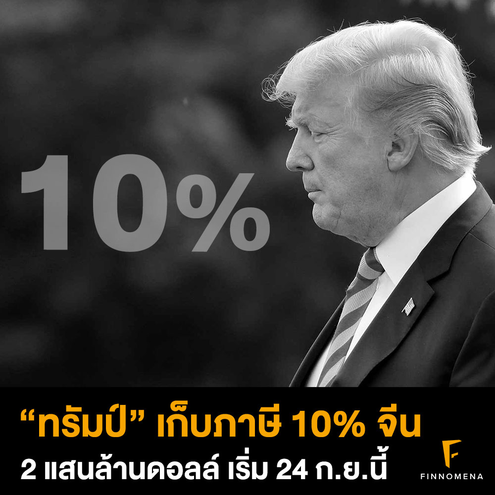 ทรัมป์ ประกาศว่าจะจัดเก็บภาษีสินค้านำเข้าจากจีนในมูลค่ารวม 2 แสนล้านดอลลาร์ ในอัตรา 10% เริ่มตั้งแต่วันที่ 24 ก.ย.ที่จะถึงนี้ จากนั้นจะพิจารณาว่าจะเก็บเพิ่มอีกในมูลค่ากว่า 2.5 แสนล้านดอลลาร์หรือไม่