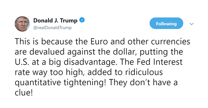 - ทรัมป์ได้ออกมาทวีตในทวิตเตอร์ส่วนตัวว่า “สกุลเงินยูโรหรือเงินอื่นๆ มีค่าเงินที่อ่อนกว่าดอลลาร์ ทำให้สหรัฐฯเกิดข้อเสียเปรียบ ธนาคารกลางของสหรัฐฯไม่ระแคะระคายเกี่ยวกับเรื่องนี้เลย” และทรัมป์ได้ทวีตอีกรอบว่า “การที่สหรัฐฯได้เงินเฟ้อที่ต่ำถือว่าเป็นสิ่งสวยงาม” หลังจากข้อความของทรัมป์ในครั้งนั้น ดอลลาร์สหรัฐฯก็ตกลงมาเล็กน้อยเมื่อเทียบกับยูโร