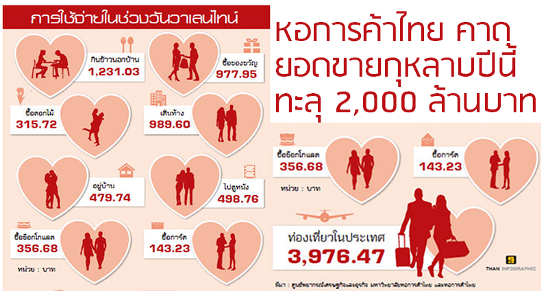 - ยอดเงินสะพัดช่วงวาเลนไทน์ ที่คล้ายๆเป็นดัชนีชี้วัดถึงสภาพเศรษฐกิจในช่วงโค้งแรกของปีว่าจะกลับมาคึกคักหรือไม่ ซึ่งปีนี้คาดว่าจะมีมูลค่าถึง 3,707 ล้านบาท สูงสุดในรอบ 10 ปี จากปีก่อนที่มีมูลค่าราว 1,500 ล้านบาท