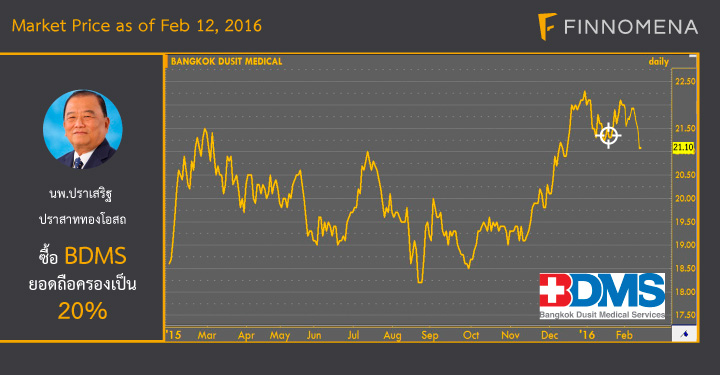 • ราคาหุ้นล่าสุดของ BDMS ณ สิ้นวันที่ 12 กุมภาพันธ์ 2559 อยู่ที่ 21.10 บาท ปรับตัวลดลงเล็กน้อย จากราคาเฉลี่ยที่คุณหมอปราเสริฐเข้าซื้อล่าสุด