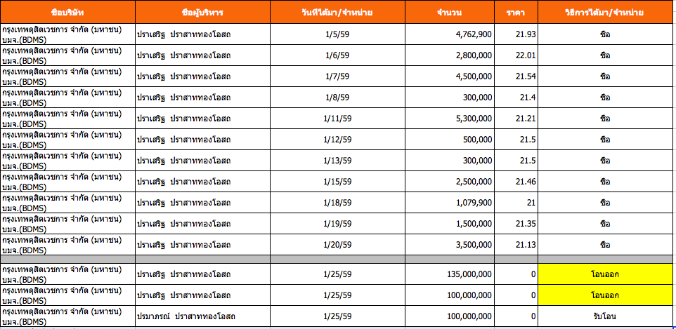• รายงานถึง ณ วันที่ 20 มกราคม 2559 เข้าซื้อรวม 27 ล้านหุ้น มูลค่ากว่า 580 ล้าน ที่ราคาเฉลี่ย 21.49 บาท/หุ้น