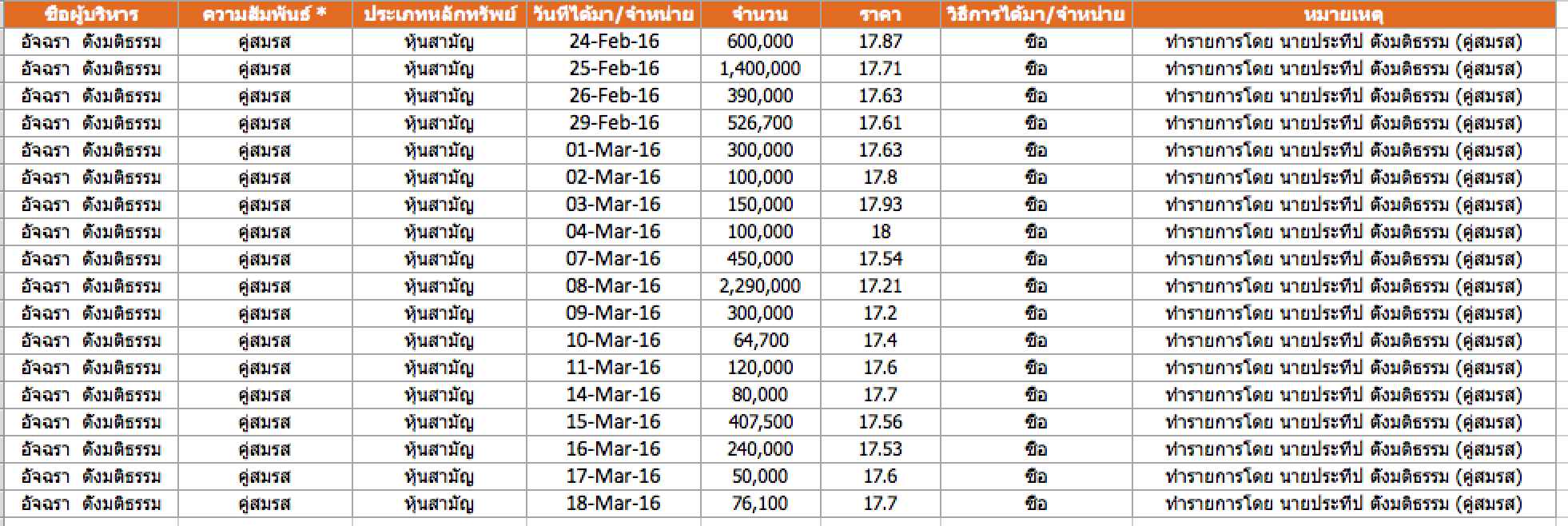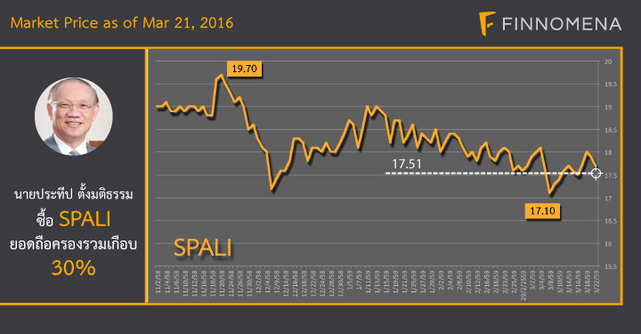รายงานถึง ณ วันที่ 21 มีนาคม 2559 ตั้งแต่ต้นปี เข้าซื้อเพิ่มอีก 7.65 ล้านหุ้น มูลค่ากว่า 134 ล้านบาท ที่ราคาเฉลี่ย 17.51 บาท/หุ้น