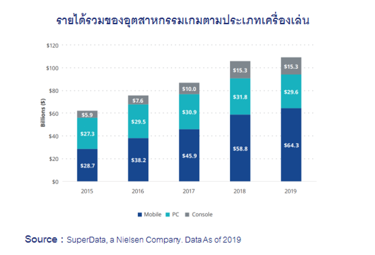 ปัจจุบันเกมในกลุ่ม E-Sport สามารถเล่นได้โดยผ่าน 3 อุปกรณ์หลัก คือ เครื่องคอมพิวเตอร์ส่วนบุคคล (PC), เครื่องคอนโซล (Console) และโทรศัพท์สมาร์ทโฟนหรือแทบเล็ต (Mobile) ซึ่งตลาดที่มีอัตราการเติบโตที่น่าสนใจ คือ ตลาด Mobile เนื่องจากสามารถเข้าถึงได้ง่ายและมีรูปแบบรายได้ที่น่าสนใจแตกต่างจากทั้ง PC และ Console