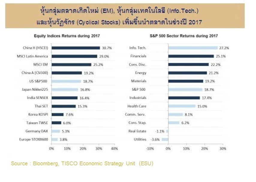 ดังนั้น ประเทศที่เศรษฐกิจมีความผันผวนต่อวัฏจักรเศรษฐกิจมาก เช่น กลุ่มประเทศที่กำลังพัฒนา (EM) ก็มักจะฟื้นตัวได้เร็วกว่ากลุ่มที่พัฒนาแล้ว (DM) โดย ในปี 2017 ตลาดหุ้นในกลุ่มประเทศเกิด ใหม่ (EM) เพิ่มขึ้นถึง 25% มากกว่าตลาด ประเทศพัฒนาแล้ว (DM) ที่ +17%