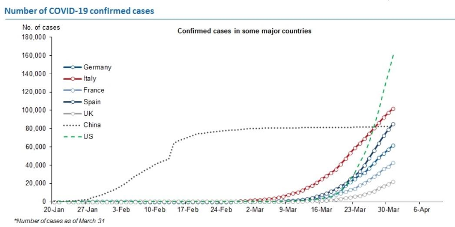 โดยนับตั้งแต่เดือน มี.ค. 2563 จำนวนผู้ติดเชื้อโควิด-19 ของจีนเริ่มทุเลาลง ในขณะที่สหรัฐฯ และยุโรปยังคงมีจำนวนผู้ติดเชื้อเพิ่มขึ้นอย่างรวดเร็ว
