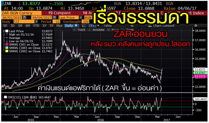 - การเมืองพ่นพิษ สัปดาห์ที่แล้ว ปธน. Jacob Zuma สั่งปลด รมว.คลัง Pravin Gordhan ซึ่งตลาดการเงินเชื่อถือ และแต่งตั้งรมว.คนใหม่ซึ่งไม่เคยมีประสบการณ์ด้านการเงินหรือธุรกิจ …ข่าวว่าเป็นเพราะ Gordhan “ขวางทาง” กระบวนการคอรัปชั่น/ฟอกเงิน… นักลงทุนวิตก เงินแรนด์แอฟริกาใต้ (ZAR) อ่อนค่ากว่า -10%