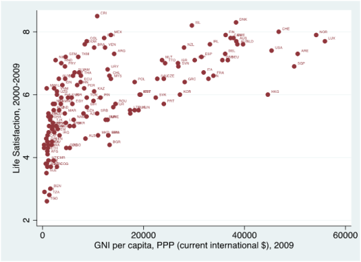 มีคนทำงานวิจัยไว้ครับ เค้าทดลองวัดความสุขของคนเทียบกับรายได้ต่อหัวประชากรของประเทศนั้นๆ ผลการวิจัยนี้ได้ข้อสรุปว่า โดยเฉลี่ยประเทศที่มีรายได้เยอะกว่าจะมีความสุขมากกว่าประเทศที่รายได้น้อยกว่า แต่เมื่อถึงจุดหนึ่งความร่ำรวยที่เพิ่มขึ้นไม่ได้ทำให้ความสุขเพิ่มขึ้นเสมอไป