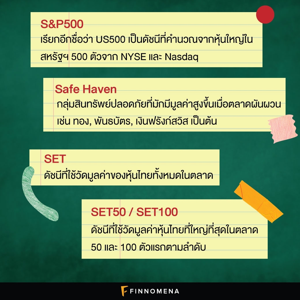 กลุ่มสินทรัพย์ปลอดภัยที่มักมีมูลค่าสูงขึ้นเมื่อตลาดผันผวน เช่น ทอง, พันธบัตร, เงินฟรังก์สวิส เป็นต้น