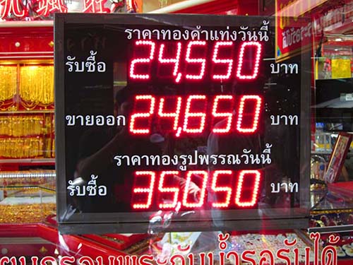 ส่วนราคาทองของไทยที่โชว์อยู่ที่หน้าร้านขายทอง หลักๆแล้วจะเป็นการรวม “3 ปัจจัย” เข้าด้วยกัน คือ ราคา Gold Spot, อัตราแลกเปลี่ยนค่าเงิน และ ค่า Premium (ค่าดำเนินการในการนำเข้าและส่งออก) โดยราคาจะแสดงเป็นหน่วย บาท/ทองคำ 1 บาท อ้างอิงตามราคาจากสมาคมค้าทองคำ ซึ่งเป็นราคาที่ได้รับการยอมรับโดยทั่วไป