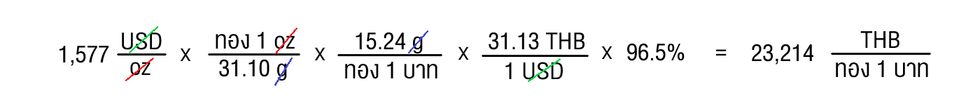 ยกตัวอย่างราคาของวันที่ 3 กุมภาพันธ์ 2020 ราคาในตลาด Gold Spot อยู่ที่ 1,577 ดอลลาร์ และราคาทองจากสมาคมค้าทองอยู่ที่ 23,200 บาท ลองค่อยๆแปลงหน่วยจาก ดอลลาร์/ออนซ์ ไปสู่ บาท/ทองคำ 1 บาท โดยคำนวณตามความบริสุทธิ์ของทองที่ขายในไทย คือ 96.5% ได้ผลลัพธ์ตามนี้ครับ