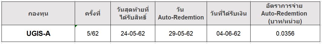 กองทุน UGIS-A ประกาศรับซื้อคืนหน่วยลงทุนอัตโนมัติ ครั้งที่ 5/2562
