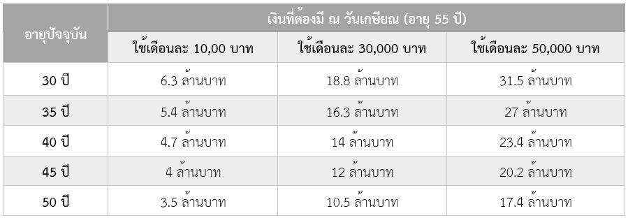 ในที่นี้ขอยกตัวอย่างชีวิตระดับกลาง ใช้ชีวิตแบบสังสรรค์บ้าง แต่ไม่ถึงขั้นจัดเต็ม (ใช้หลังเกษียณเดือนละ 30,000 บาท)