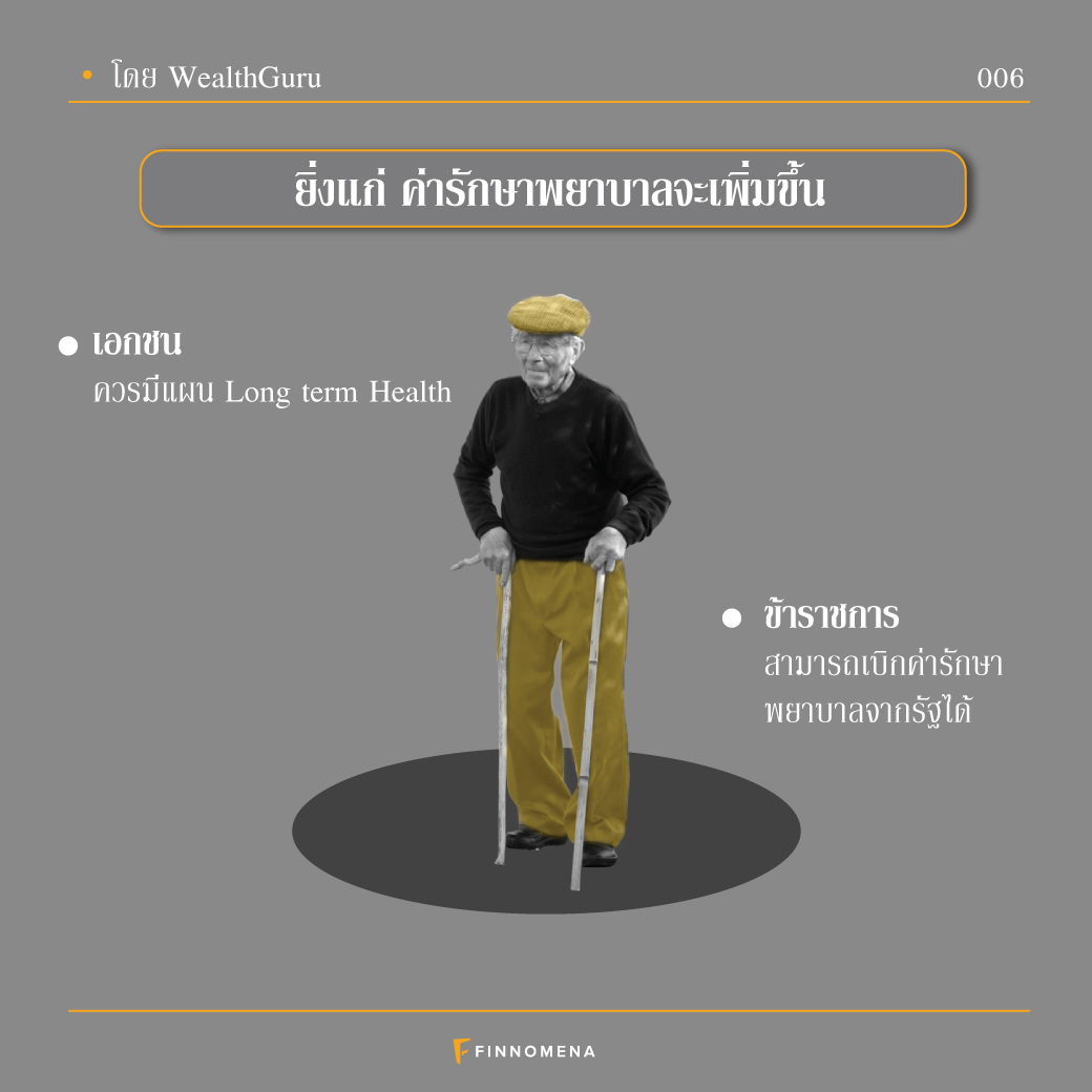 ข้าราชการจะสามารถเบิกค่ารักษาพยาบาลจากรัฐได้ แต่คนทำงานเอกชนละ หลังเกษียณจะต้องทำอย่างไรกับค่ารักษาพยาบาลที่มากขึ้นตามอายุ ดังนั้นส่วนหนึ่งควรจะมีแผน Long term Health เพื่อช่วยบรรเทาปัญหานี้