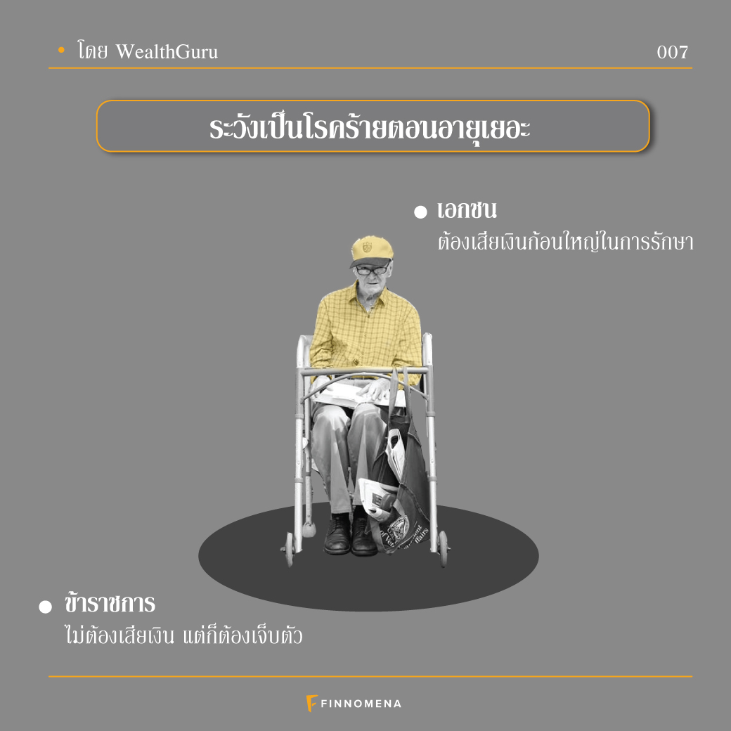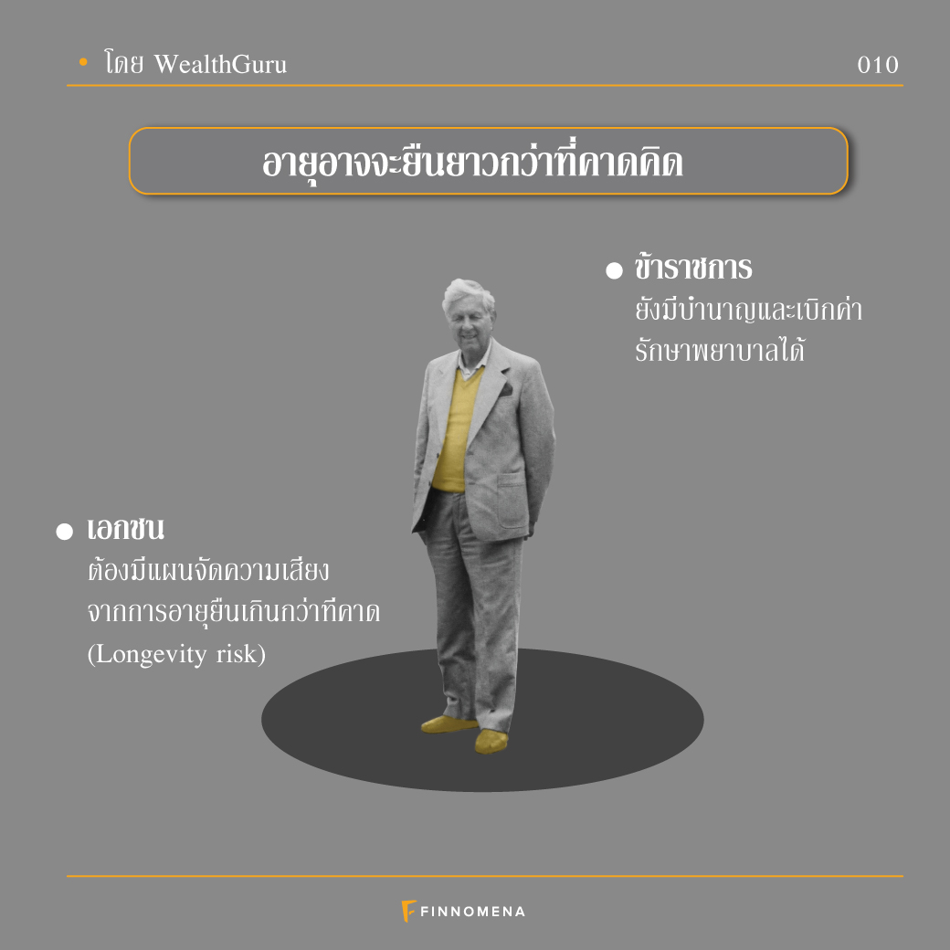 ถ้าเป็นข้าราชการไม่มีปัญหา เพราะยังมีบำนาญและเบิกค่ารักษาพยาบาลได้ แต่คนทำงานเอกชน ก็จะต้องมีแผนจัดความเสี่ยง ที่เรียกภาษาการเงินว่า Longevity risk ความเสี่ยงจากการอายุยืนเกินกว่าที่คาด