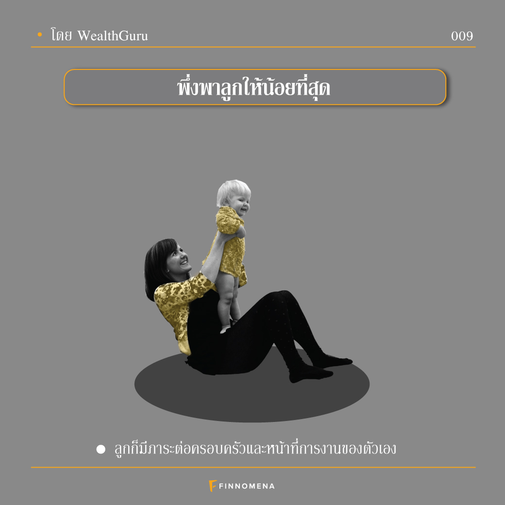 คุณพ่อแม่ บอกผมว่า ตนเป็นที่พึ่งเองตน พยายามจะพึ่งพาลูกให้น้อยที่สุด ไม่เป็นภาระให้ลูกหลาน ลูกก็มีภาระต่อครอบครัวและหน้าที่การงาน ผมก็ควรจะทำเช่นกันในยามเกษียณ เก็บเงินไว้เกษียณเองจะได้ไม่เป็นภาระลูกหลานในอนาคต